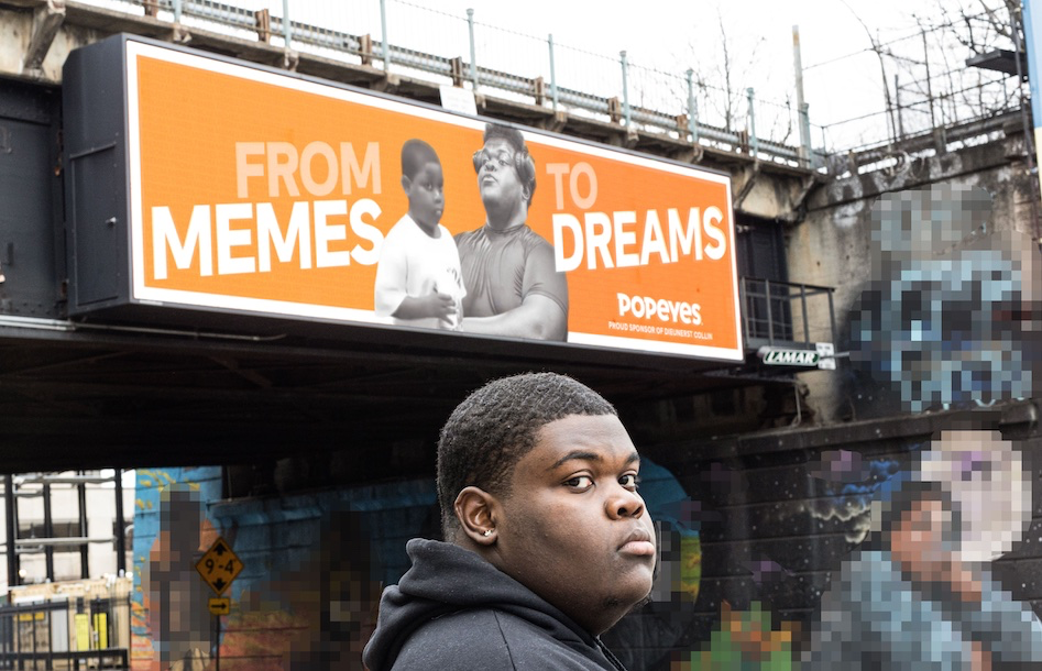 His friend was right. Popeyes also erected a billboard of Collin in his East Orange, New Jersey hometown which features the viral image and a new photo of the adult version of Collin mimicking his 9-year-old expression with a larger Popeyes drink in his hand.